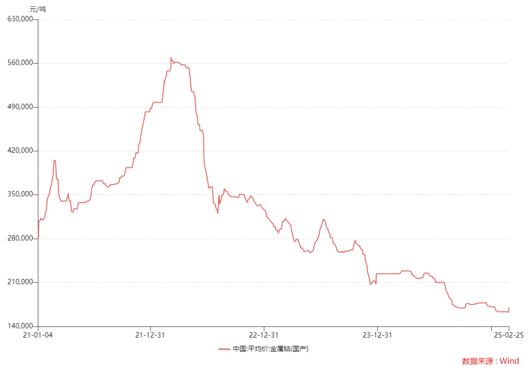 近年来,钴价总体呈下滑走势。安泰科数据显示,截至2月25日,国产金属钴价报17.05万元/吨,环比微涨。总体上看,2022年一季度以后,钴价呈现震荡下跌的走势,跌势已长达近三年。由此,业内人士推测,钴价持续下行是刚果(金)此次限制出口举措的主因。刚果(金)拟通过减少供应的方式,推动钴价反弹。